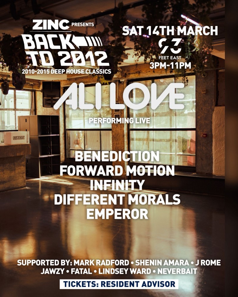 Zinc presents Back To 2012 featuring Ali Love, performing his inconic deep house anthems